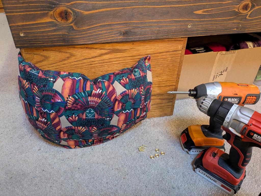 The only problem with using screws was needing to make a hole in the cloth for the screw to go through. That turned out to be surprisingly difficult. Using the drill didn't work at all: it just tore up the fabric and clogged up the drill bit with threads that had to be unraveled.