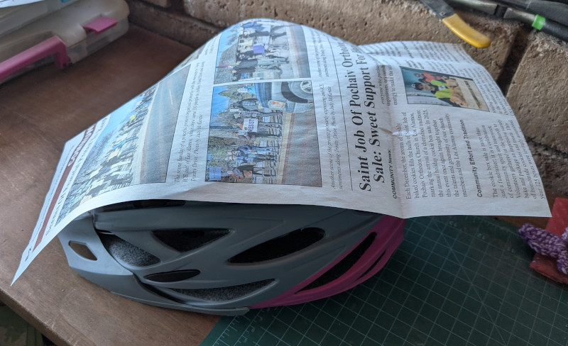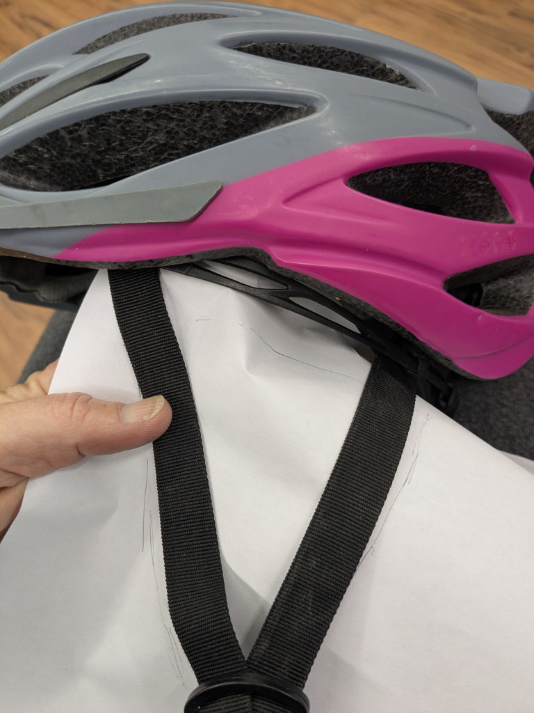 Once I had a basic cover more or less fitting on the helmet, it was time to work on the straps. I found it a little tricky to make the pattern for the straps, because it was hard to hold the helmet, the straps, the paper and a pen all at the same time. But fortunately it only needed to be approximate.
