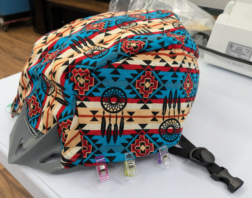 Finally, I threaded some elastic through the bottom hem with an embroidery needle, then slid it onto the helmet and tied the elastic tight enough to hold the cover in place. The covered helmet was now ready to wear!