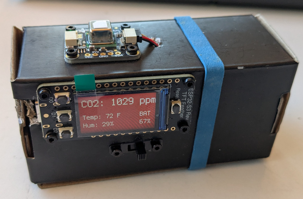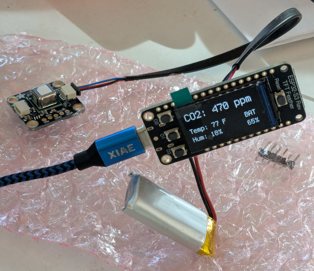![[Looking down into a small cardboard project box. There's the underside of a microcontroller, with a cable that runs from it out through a hold in the side of the box. Then there's a power cable, red and black, that runs from a power switch through a JST plug to the microcontroller and a slim li-po battery that's velcroed to the side of the box. All the components are screwed to the sides of the box with black machine screws and nuts.]](https://shallowsky.com/blog/images/hardware/airCO2/PXL_20251211_202237095T.jpg)