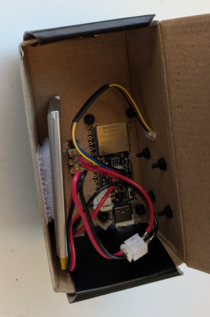 Then of course there was the question of how to carry it around. I used a small cardboard battery box from an R/C plane battery, the smallest box I happened to have handy. It's a little bigger than it needs to be, but still fairly small; maybe eventually I'll cut off one end. 2mm machine screws were a good size to fit through the mounting holes in the Feather and the SCD-40 sensor.