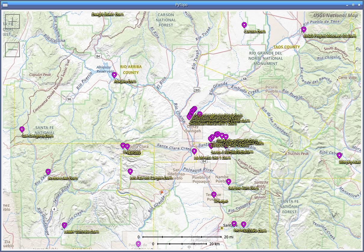 pytopo all-us-dams.geojson homeWithout that, PyTopo tries to display too wide an area and ends up getting a math error trying to do its cosines and tangents. I'm working on that now, it'll be fixed by later tonight.