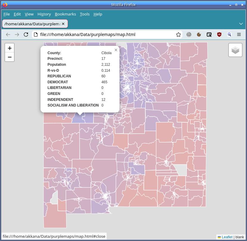 At first, for testing, I used the NM precinct data file since it was so much smaller. (In fact, in the beginning I started by using only Los Alamos county, since it's tiny and made testing much faster, and in any case, the actual question I'd been trying to answer that sparked this investigation concerned a comparison between districts in White Rock.) It looks like this: