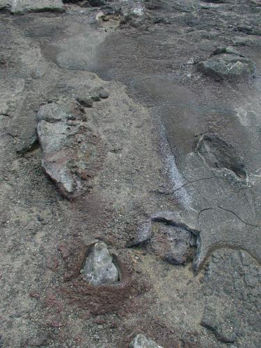 Volcanic bombs buried in lava flow